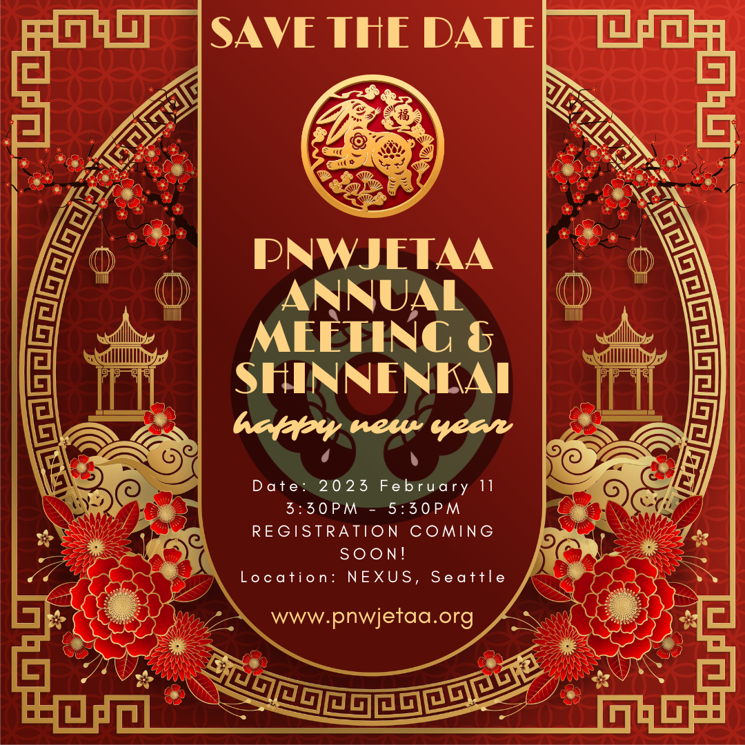 Hello, 2023! Happy New Year, all! We're celebrating 2023 and the start of a new year with our Annual Meeting and Shinnenkai, held again this year at NEXUS Seattle, and livestreamed via Zoom. We warmly welcome fellow alumni, community members, family and friends to join our annual event. Attendee gift, raffle prizes, and cultural interactive activities will abound! Children 15…